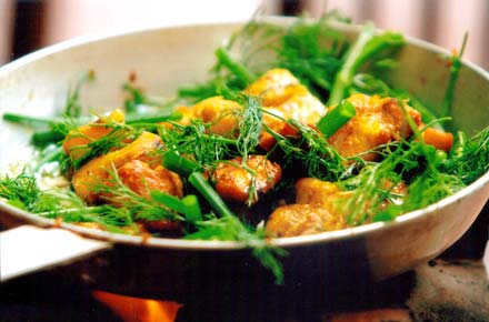 Le cha ca demande une technique sophistiquée et beaucoup de minutions. Il porte l’identité de la gastronomie très particulière de Hanoi. Le ca chien, barge et le ca lang, hemibragus sont spécialement utilisés dans ce plat. Ces 2 poissons vivent en général dans le fleuve Rouge. Avant le grillage, on applique du saindoux sur les poissons hachés en morceau pour qu’ils ne soient pas trop décharnes. On met du poisson dans une pince en bambou et le grille les 2 côtes avec de la braise. On peut utiliser un gril en acier mais il faut l’appliquer du saindoux pour que le poisson ne colle pas au gril. On met ensuite une couche de hachis, une couche d’aneth, d’oignon, de plantes aromatiques, de coriandre dans un grand bol.
