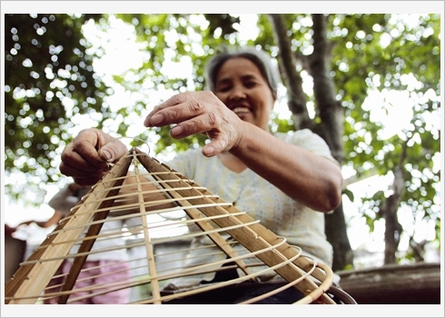Le processus de confection est, lui, plus complexe. Les feuilles de latanier doivent tout d’abord être bien séchées. Ceci fait, les artisans les aplatissent au moyen d’une sorte de fer à repasser à une température précise, afin de ne pas les brûler. Une température insuffisante ne permettra pas d’atteindre la planéité nécessaire. Puis, les feuilles sont fumées avec du soufre pour qu’elles se décolorent à blanc et soient résistantes à la moisissure. Les tiges de bambou sont coupées dans le sens de la longueur pour faire l’armature, composée la plupart du temps de 16 cerceaux, laquelle est ensuite fumée pour résister aux termites et autres insectes xylophages.