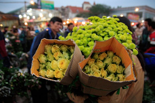 Les fleurs proposées au marché proviennent des environs de Hanoï, mais aussi de Dalat. On y trouve à la fois des fleurs cultivées au Vietnam, des roses, des iris, des chrysanthèmes, mais aussi des fleurs importées, comme des tulipes, par exemple comme c’est un marché essentiellement nocturne, les clients y viennent le plus souvent munis d’une torche électrique pour vérifier la qualité et la couleur des fleurs. Ngo Thu Hien, une Hanoïenne: « Aujourd’hui, c’est le premier jour du mois lunaire. Le marché est donc plus animé que d’habitude. Dehors, il n’y a pas un chat dans les rues, mais ici, c’est l’effervescence. Il y a tellement de fleurs ! Je ne sais plus où donner de la tête! »