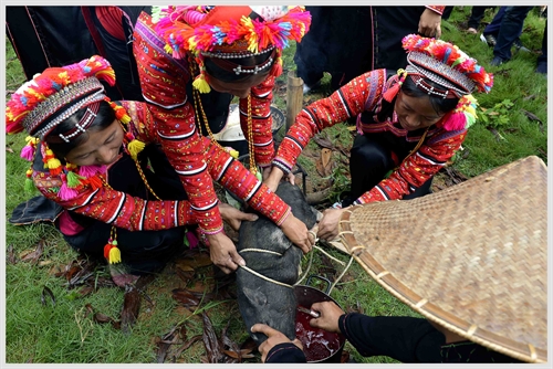 Les filles apportent des offrandes à la grande terrasse au bout du village pour faire des cérémonies.