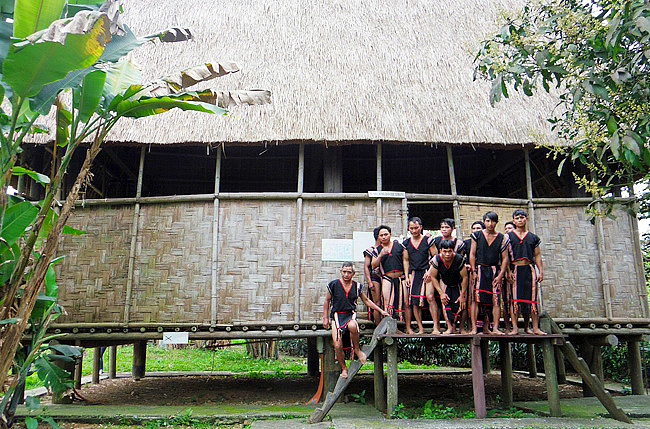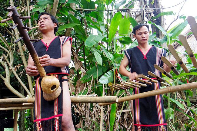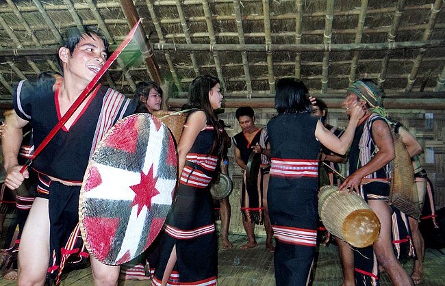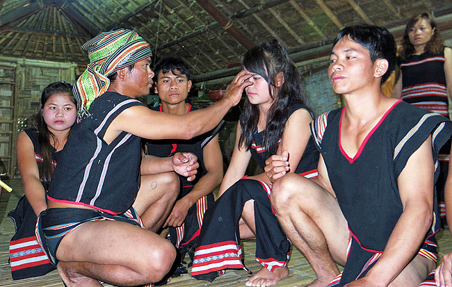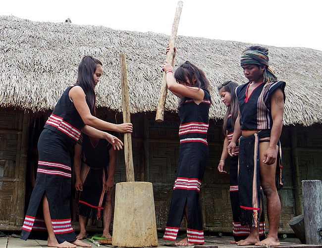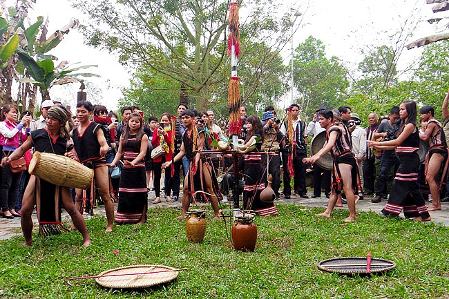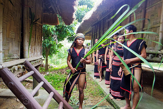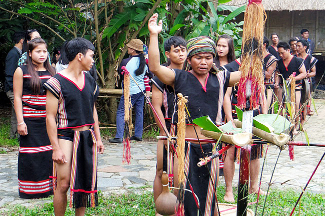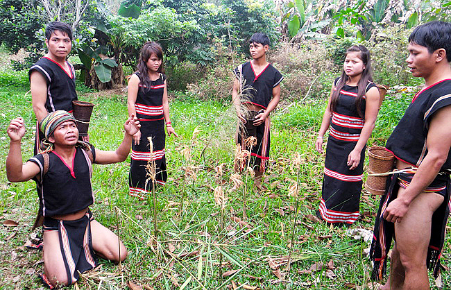 La plantation du «cây nêu» (perche rituelle) devant la maison communale est un rite important. Selon la tradition des Xê Dang, les femmes n’y participent pas.
