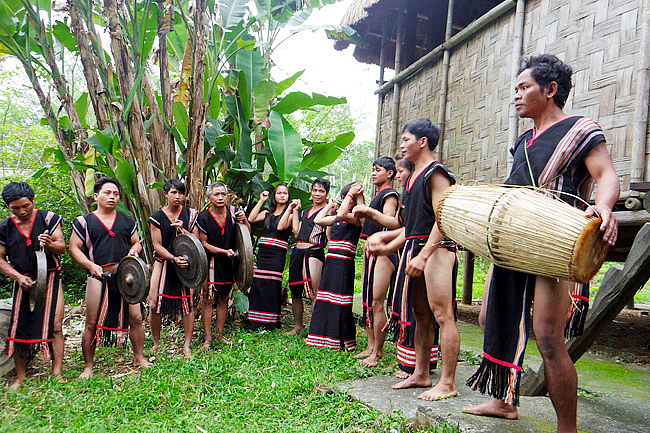 Le chef du village frappe le tambour invitant les hommes à apporter les objets de culte à la maison communale (nhà rông).