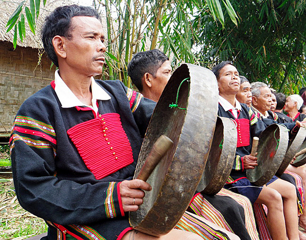 Les villageois jouent des gongs-instruments de musique polyphonique connus des ethnies minoritaires au Vietnam.