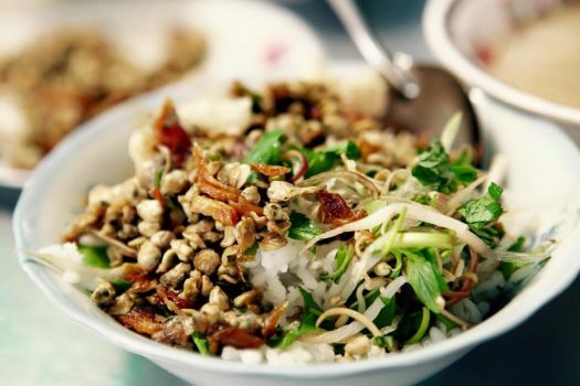On place les fines herbes et le riz dans un bol, puis on met dessus une couche de corbicule, de cacahuètes sautées, de carambole et des tranches de peau de porc frites. On couvre la surface d’un mélange de sésame, de quelques feuilles de basilic et on l’arrose du bouillon de corbicule, de la salaison de Hue et du piment.