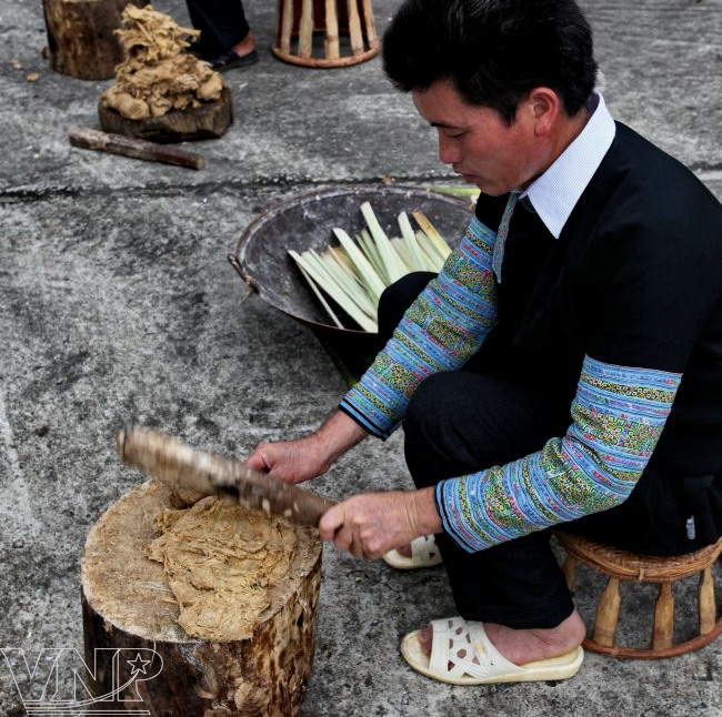 Après avoir bouilli les morceaux de jeunes bambous une nuit, les H’mông écrasent les fibres au pilon pour faire de la pâte à papier .