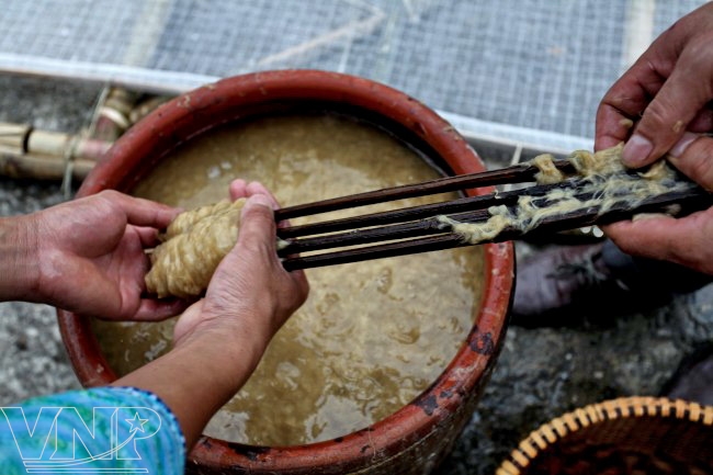 Sùng A Pha, 49 ans, de la commune de Pà Co à Mai Châu, province de Hoà Binh, a confié : «Les H’mông pratiquent la papeterie depuis longtemps. Dans les derniers mois de l’année, nous allons souvent en forêt pour couper du bambou giang ». L’écorce est retirée, puis les tiges sont coupées en petits morceaux, qui sont bouillis une nuit. Ensuite, ils sont maintenus humides dans un endroit frais pendant un certain temps. Lorsqu’ils deviennent mous, ils sont écrasés au pilon jusqu’à ce que les fibres deviennent lisses et soyeuses. Celle-ci sont laissées à baigner dans de l’eau puis filtrées pour enlever les impuretés.