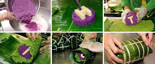 Le riz gluant est mélangé avec du lait de coco, du sel et du sucre puis emballé dans des feuilles de bananier.