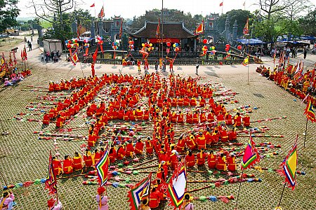 Cette réjouissance rituelle vient de Hoa Lu et de Tam Ðiêp, province de Ninh Bình. Le groupe comprend souvent trente-deux garçons de moins de quinze ans, vêtus d’un pantalon bleu, d’une veste blanche bordée de rouge et de jambières. Lire la suite